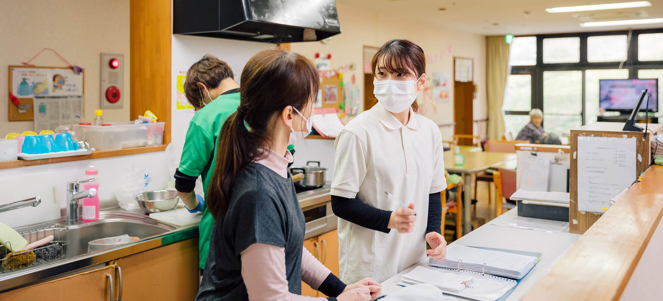 当時、身内が同施設の厨房で働いていたので、転職活動の中で自然と介護の仕事を意識するようになりました。身内から施設での様子を聞いたり、介護の仕事について自分なりに考えたりするうちに、例え介護の仕事が未経験でも、これまでの接客業での経験はきっと生かせるはずだと思い、思いきって施設見学へ。山間部の自然豊かな場所にあること、職員やご利用者様のアットホームな雰囲気に魅力を感じました。