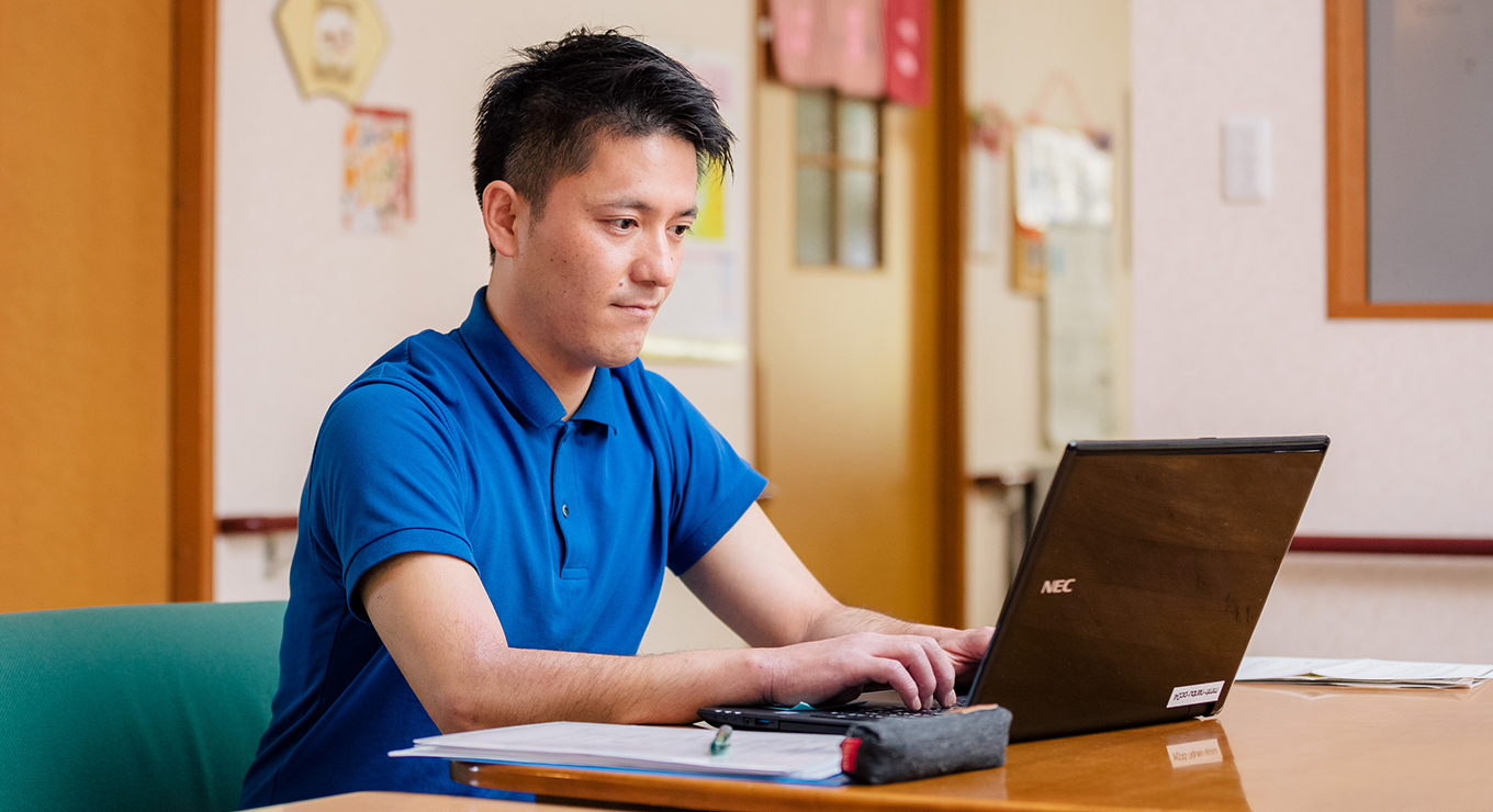 デイサービスでの介護業務を経て、2019年より主任としてデイサービス・グループホームの全体を見る立場となりました。基本的にはデイサービスでの業務が多いのですが、通常の介護業務の他、施設の運営にも携わらせていただいています。
