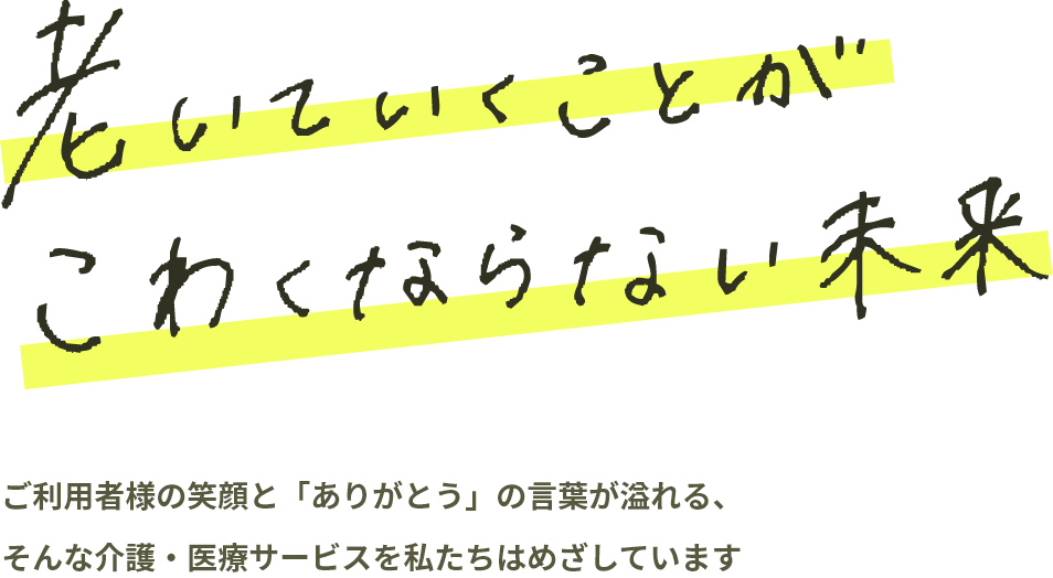 ご利用者様の笑顔と「ありがとう」の言葉が溢れる、そんな介護・医療サービスを私たちはこれからも追い求めていきます。毎日笑って、楽しく仕事しませんか?