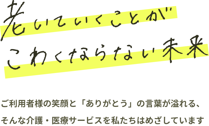ご利用者様の笑顔と「ありがとう」の言葉が溢れる、そんな介護・医療サービスを私たちはこれからも追い求めていきます。毎日笑って、楽しく仕事しませんか?